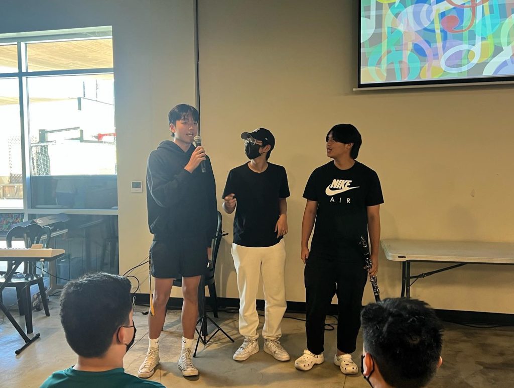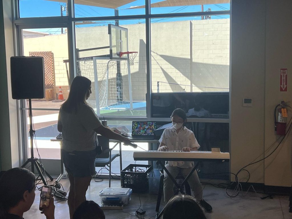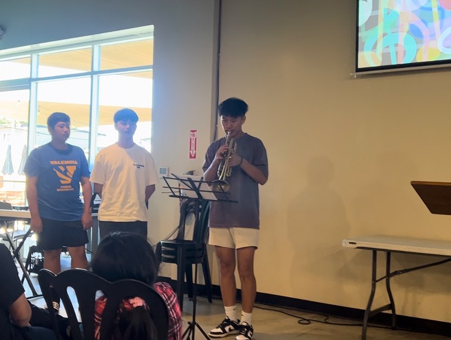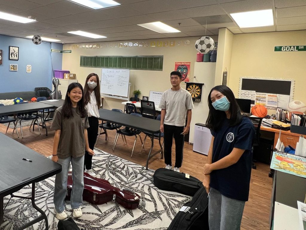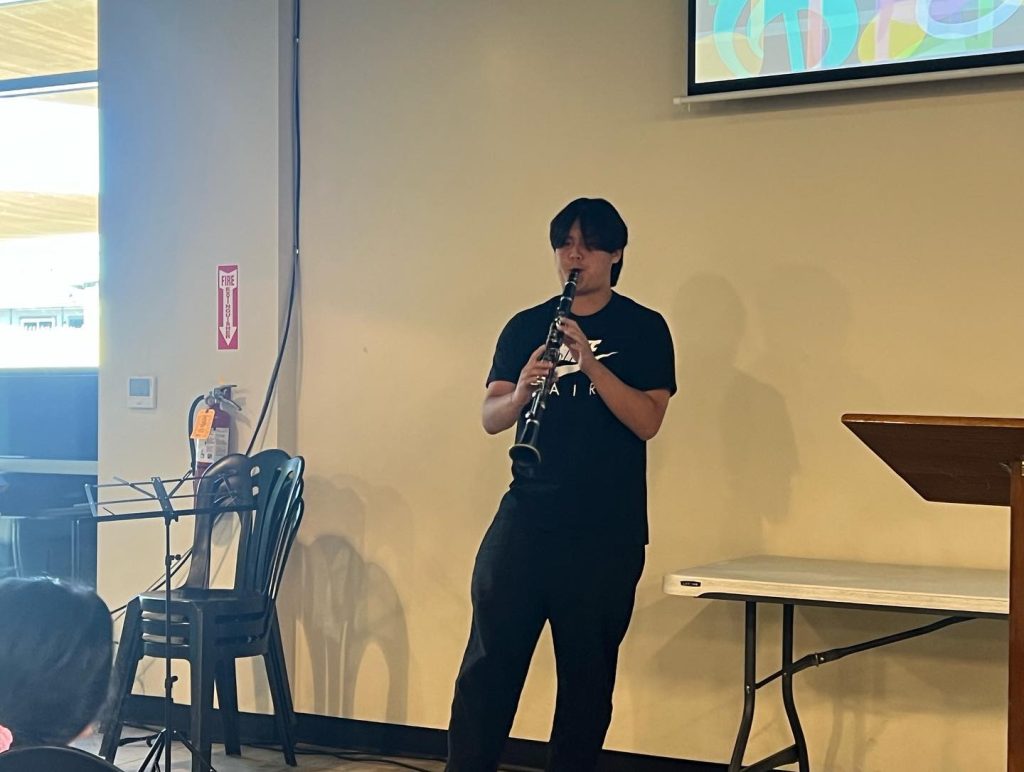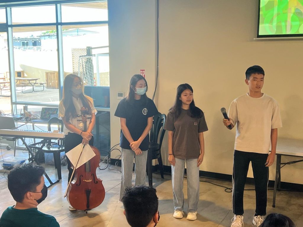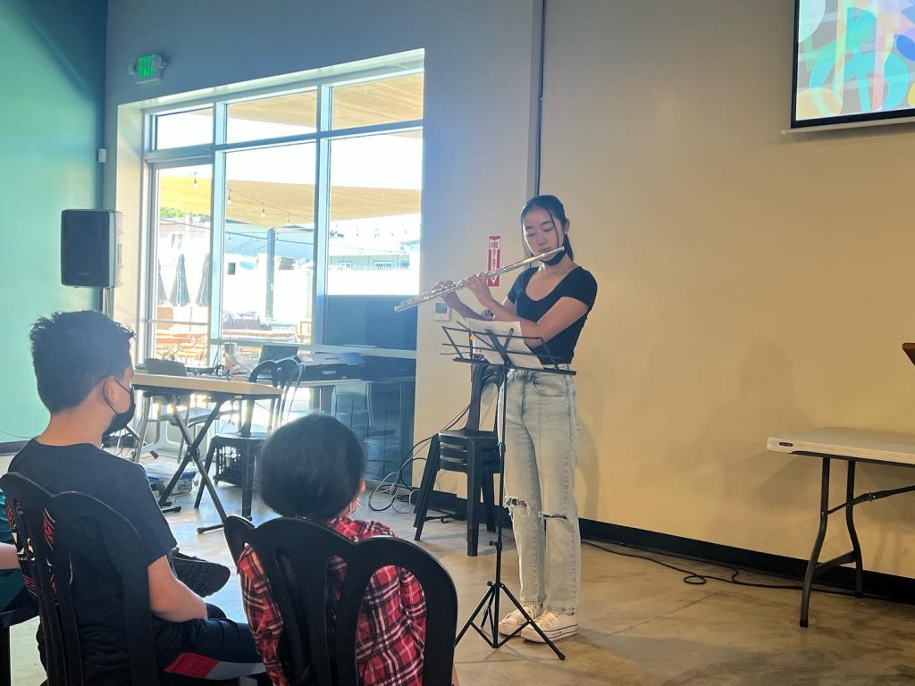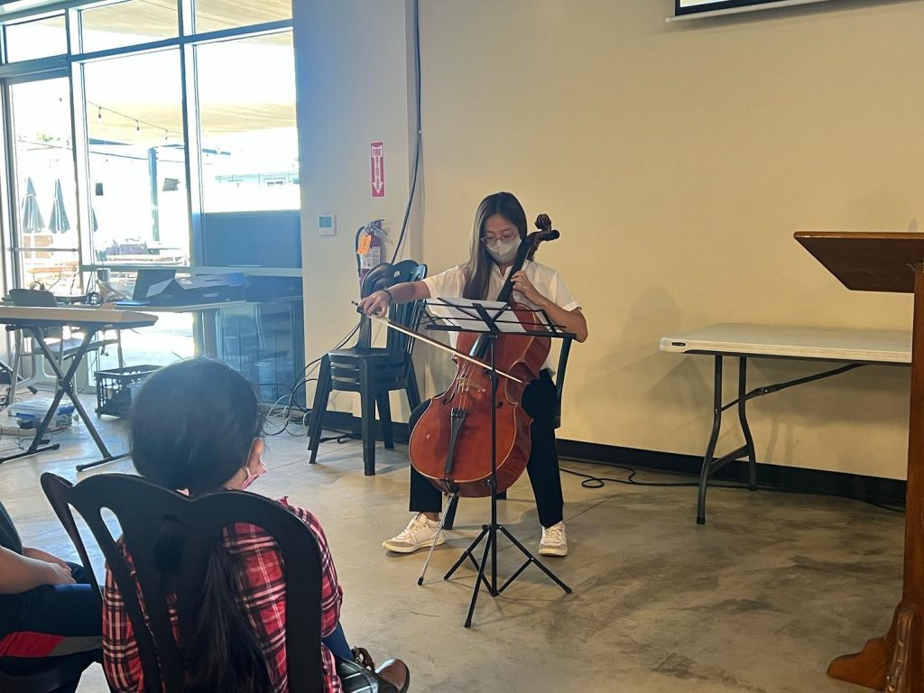 Nathan Lee, a violin volunteer in his 3rd year of teaching, is performing a piece of music to students as a showcase.Chloe Jung, a senior flute volunteer, is presenting a piece for flute students.Lena Limb is performing a piece to showcase the cello music.Hennah Kim, a piano volunteer in her 2nd year of teaching, is showcasing a piece of piano music.Ryan Lee, a first year viola volunteer, is presenting a piece to showcase the instrument.John Yang, a clarinet volunteer in his 2nd year of teaching, is presenting a piece of music.Andrew Lim, a senior trumpet volunteer in his 4th year of teaching, is demonstrating the instrument with a piece of music.