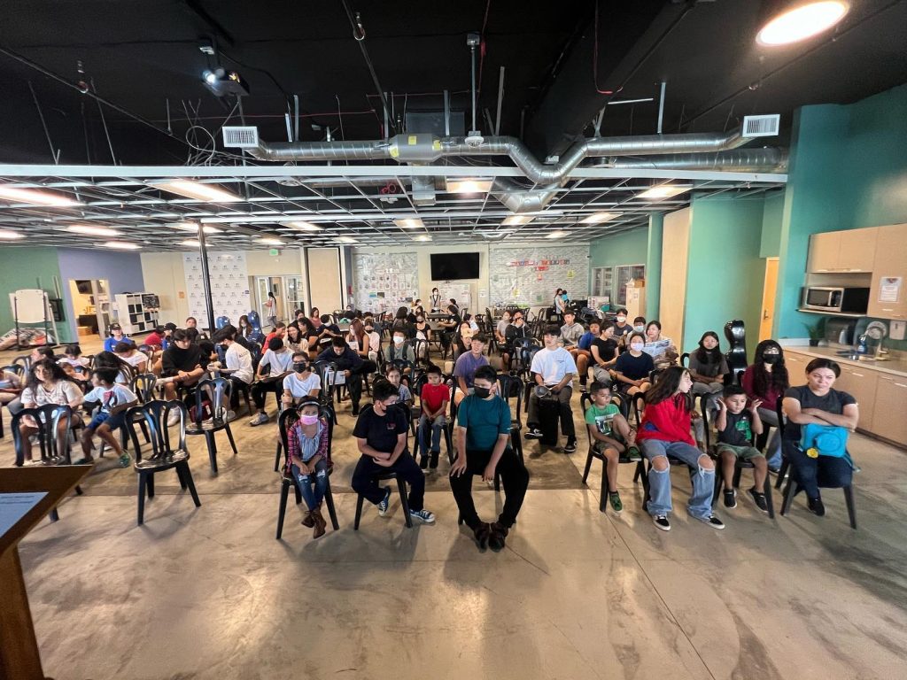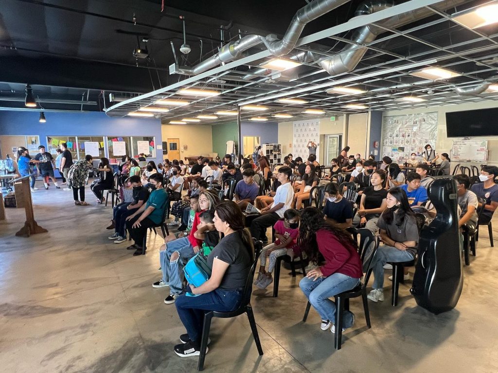 Seated are Love in Music (LM) volunteers, students and family members at its Santa Ana Branch at the Fall 2022 Class Opening Meeting.A group of LM Volunteers are attentively listening during the volunteer orientation led by KidWorks, while the students and family members are attending an orientation for students in the main auditorium.LM Family at KidWorks at its Fall 2022 Class Opening EventA group of violin teachers is being introducedA group of piano teaching volunteers being introducedA viola teaching teamA cello teaching teamA clarinet teaching teamA flute teaching teamA trumpet teaching team